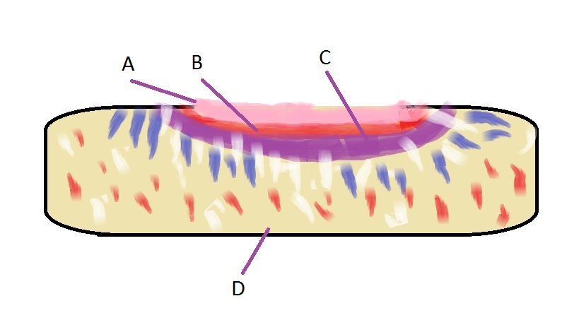 The above figure shows Bacteria attack through skin. "D" is the body part affected with red/white blood cells and antibiotic in blue, "A" is Bacteria species, "B" is the toxins released, "C" is scarring on the tissue.